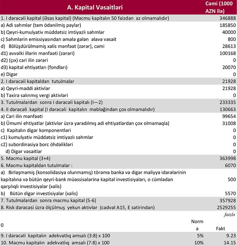 Müqayisə üçün qeyd edək ki, 2018-ci ilin yanvar-sentyabr dövründə “Kapital Bank”ın cəmi gəlirləri 344 milyon 787 min manat (faiz gəlirləri 234 milyon 57 min manat, qeyri-faiz gəlirləri 110 milyon 730 min manat), cəmi xərcləri 178 milyon 424 min manat (faiz xərcləri 57 milyon 782 min manat, qeyri-faiz xərcləri 120 milyon 642 min manat) təşkil etmişdi. Xərclər gəlirlərdən çıxıldıqdan sonra Bankın 166 milyon 363 min manat əməliyyat mənfəəti qalmışdı.