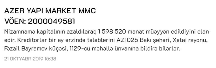 "Azər Yapı Market" MMC nizamnamə kapitalının azaldılaraq 1 milyon 598 min 520 manat müəyyən edildiyini elan edib.