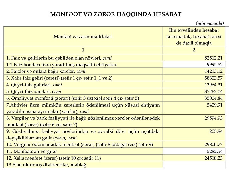 “Qeyd etmək lazımdır ki, bankın maliyyə-təsərrüfat fəaliyyətində müşahidə olunan müsbət trend, əsasən gəlir gətirən aktivlərin diversifikasiyası, yeni müştərilərin cəlb olunması, əməliyyat gəlirlərinin artırılması və xərclərin optimallaşdırılması nəticəsində yaranıb. 2019-cu ilin yanvar-sentyabr dövrü ərzində Bankın faiz gəlirləri ötən ilin anoloji dövrünə nisbətən 366 min manat (0,45%) artaraq 82 milyon 510 min manat, faiz xərcləri isə 3.3 milyon manat (18,84%) azalaraq 14 milyon 210 min manat təşkil edib. Qeyri-faiz gəlirləri isə 9 milyon 990 min manat (251,52%) artaraq 13 milyon 960 min manat, qeyri-faiz xərcləri isə 6 milyon 760 min manat (22%) artaraq 37 milyon 260 min manat təşkil edib.