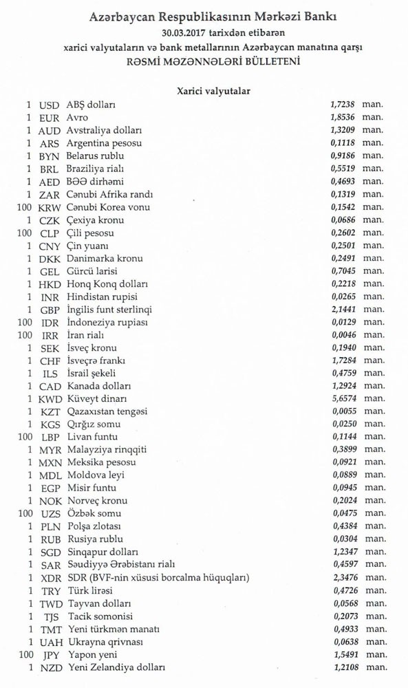 Martın 29-da 1 dollar 1,7220 manata, 1 avro isə 1.8623 manata bərabər idi.
