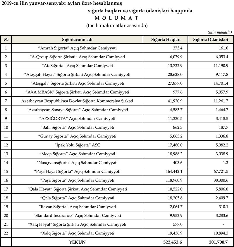 2019-cu ilin 9 ayı ərzində “PAŞA Həyat Sığorta”, “PAŞA Sığorta” və Dövlət Sığorta Kommersiya Şirkəti (Azərsığorta) tərəfindən cəmi 325 milyon 322 min manat sığorta haqları hesablanıb. Bu məbləğ 22 sığorta şirkətinin topladığı cəmi sığorta haqlarının 62,3%-nə bərabərdir.