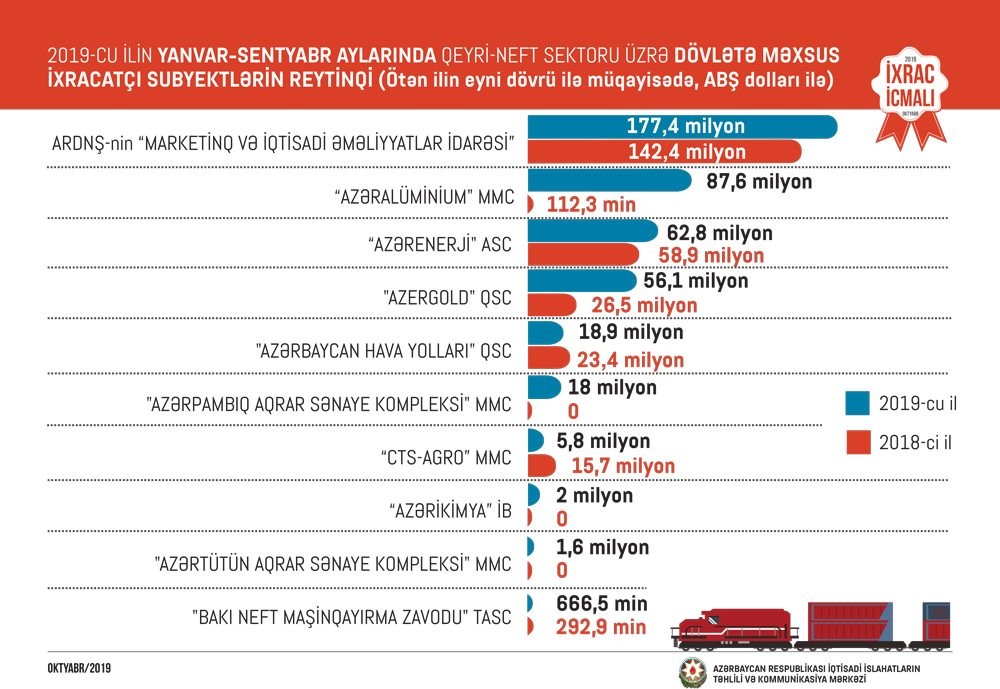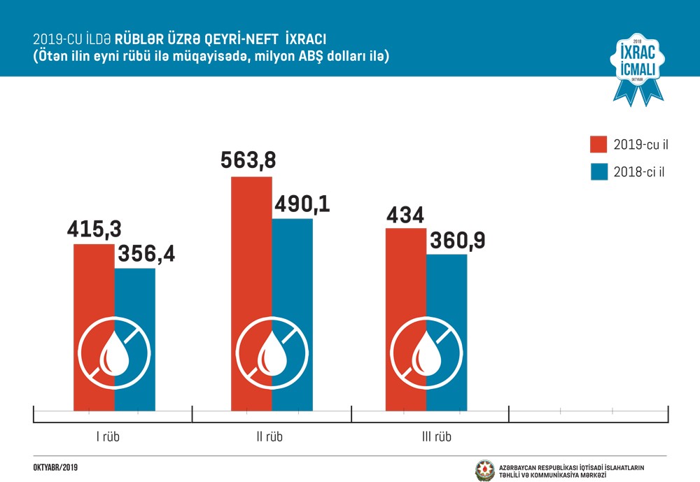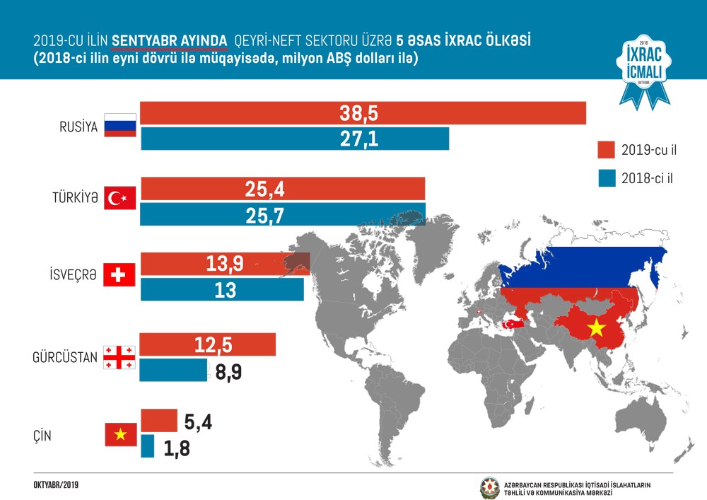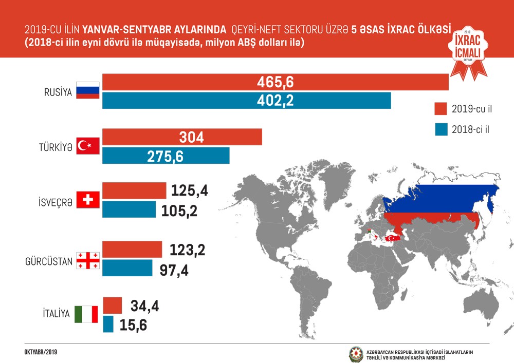 2018-ci ilin müvafiq dövrü ilə müqayisədə 2019-cu ilin 9 ayında Rusiyaya qeyri-neft ixracı 16 faiz, Türkiyəyə 10 faiz, İsveçrəyə 19 faiz, Gürcüstana 26 faiz və İtaliyaya 2,2 dəfə artıb.