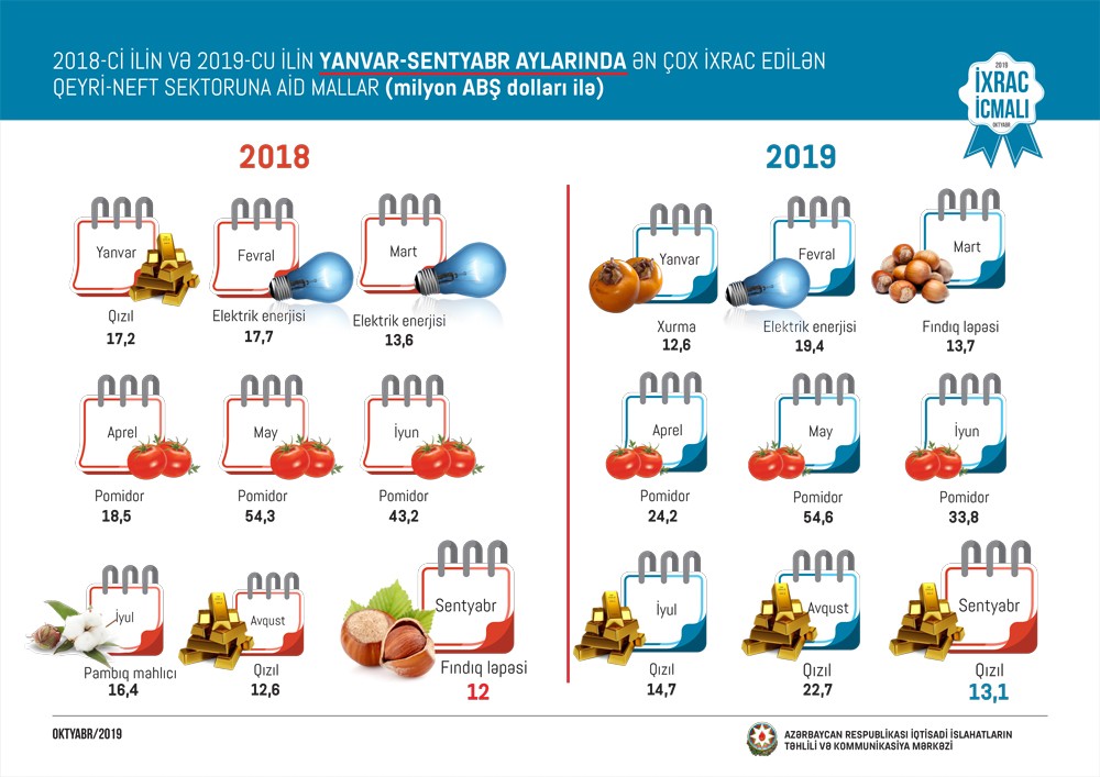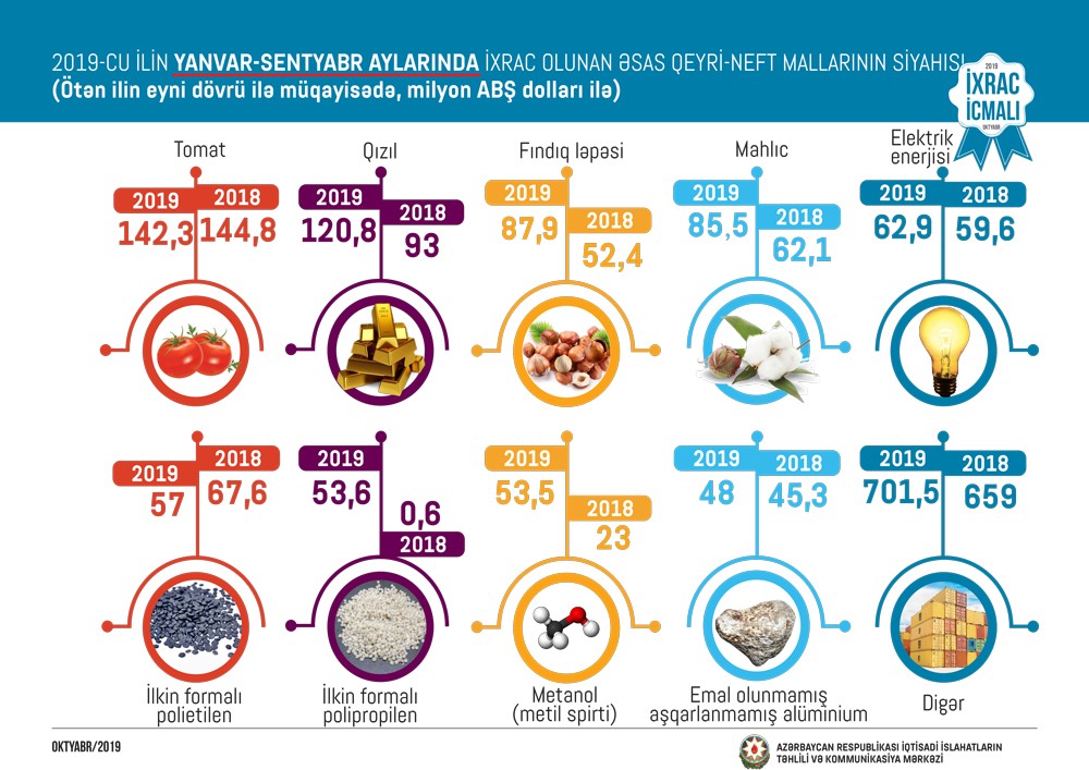 2019-cu ilin yanvar-sentyabr ayları ərzində ixrac edilən qeyri-neft sektoruna aid malların siyahısında pomidor (142,3 milyon ABŞ dolları) liderliyini qoruyub. Bu siyahıda qızıl (sikkə kəsilməsində istifadə olunmayan, digər emal olunmamış formalarda – 120,8 milyon ABŞ dolları) ikinci və qabığı təmizlənmiş meşə fındığı (87,9 milyon ABŞ dolları) üçüncü yerdə qərarlaşıb.