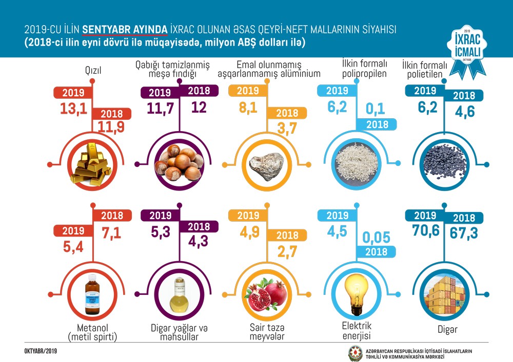 2019-cu ilin sentyabr ayında qeyri-neft sektoru üzrə ixracda qızıl (sikkə kəsilməsində istifadə olunmayan, digər emal olunmamış formalarda - 13,1 milyon ABŞ dolları) birinci, qabığı təmizlənmiş meşə fındığı (11,7 milyon ABŞ dolları) ikinci, emal olunmamış aşqarlanmamış alüminium (8,1 milyon ABŞ dolları) üçüncü olub.