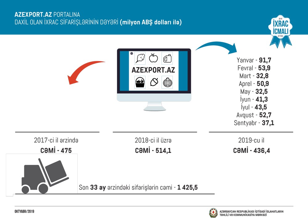 Məlumat üçün qeyd edək ki, 2017-ci ilin yanvar ayından 2019-cu ilin 30 sentyabr tarixinə kimi (33 ay ərzində) Azexport.az portalına dünyanın 136 ölkəsindən daxil olan ixrac sifarişlərinin dəyəri 1 milyard 425,5 milyon ABŞ dolları təşkil edib.