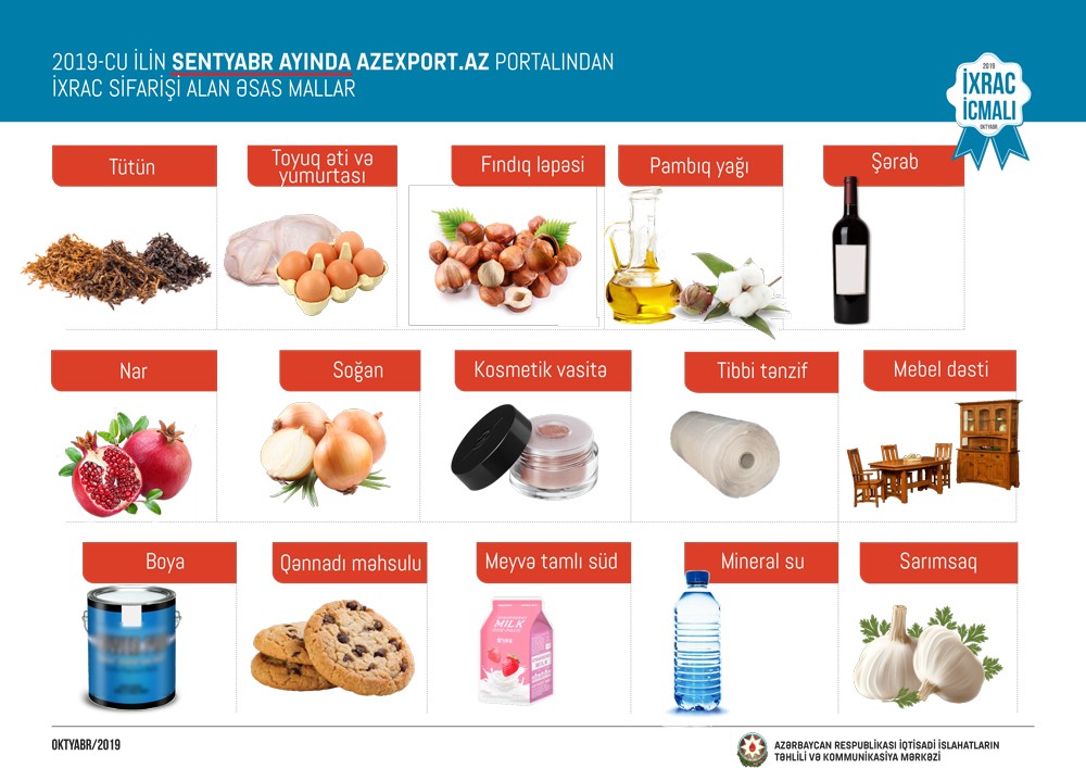 Bu ilin sentyabr ayında Azexport.az portalına ənçox ixrac sifarişi tütün, toyuq əti və yumurtası, fındıq ləpəsi, pambıq yağı, şərab, nar, soğan, kosmetik vasitə, tibbi tənzif, mebel dəsti, boya, qənnadı məhsulu, mineral su, sarımsaq, meyvə konsentratı, təzə meyvə, mürəbbə, tikinti materialı, süd məhsulları, zəli və s. mallara daxil olub.