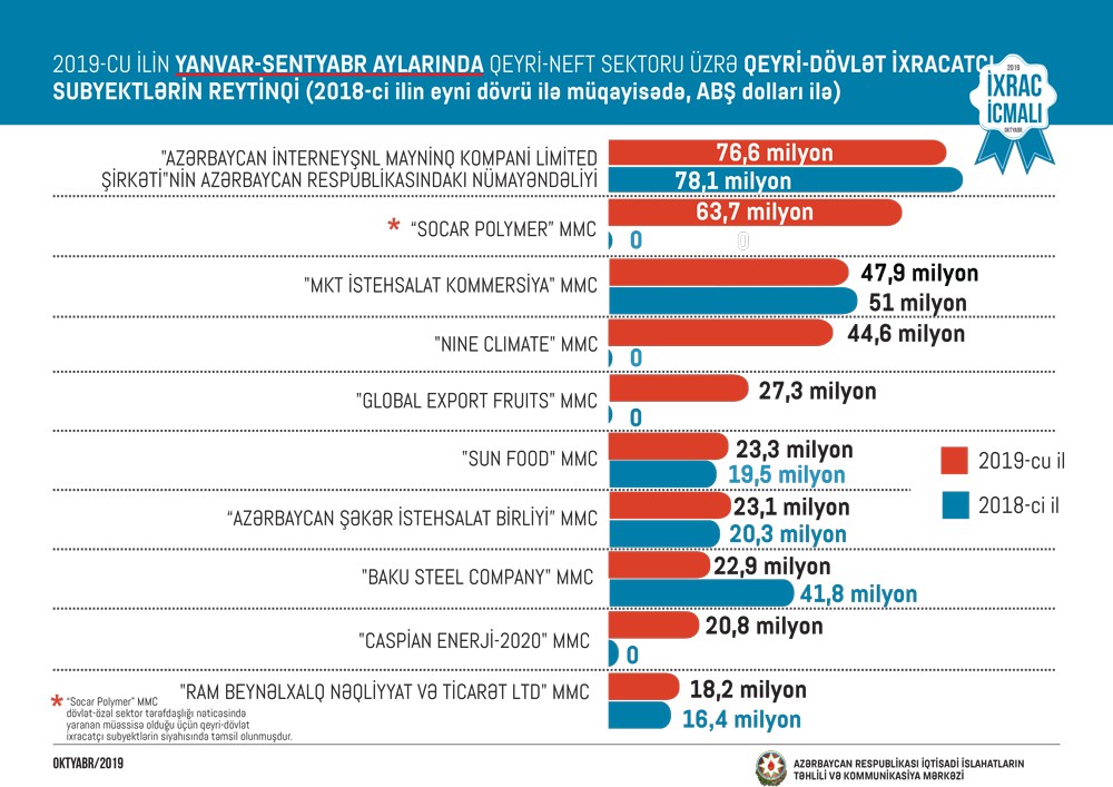 2019-cu ilin sentyabr ayında isə qeyri-neft sektoru üzrə ixrac 136 milyon ABŞ dolları təşkil edib. 2018-ci ilin sentyabr ayı ilə müqayisədə 2019-cu ilin sentyabr ayında qeyri-neft sektoru üzrə ixrac 22 milyon ABŞ dolları və ya 19 faiz artıb.