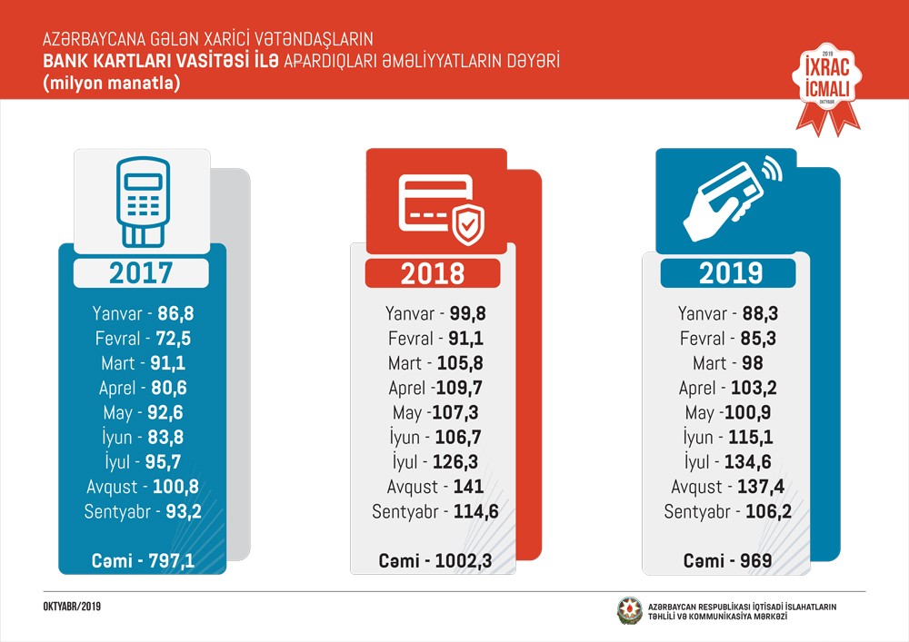 Müqayisə üçün qeyd edək ki, 2018-ci ilin yanvar-sentyabr ayları ərzində Azərbaycana gələn xarici vətəndaşların bank kartları vasitəsi ilə apardıqları əməliyyatların dəyəri 1 milyard 2,3 milyon manat təşkil etdmişdi.