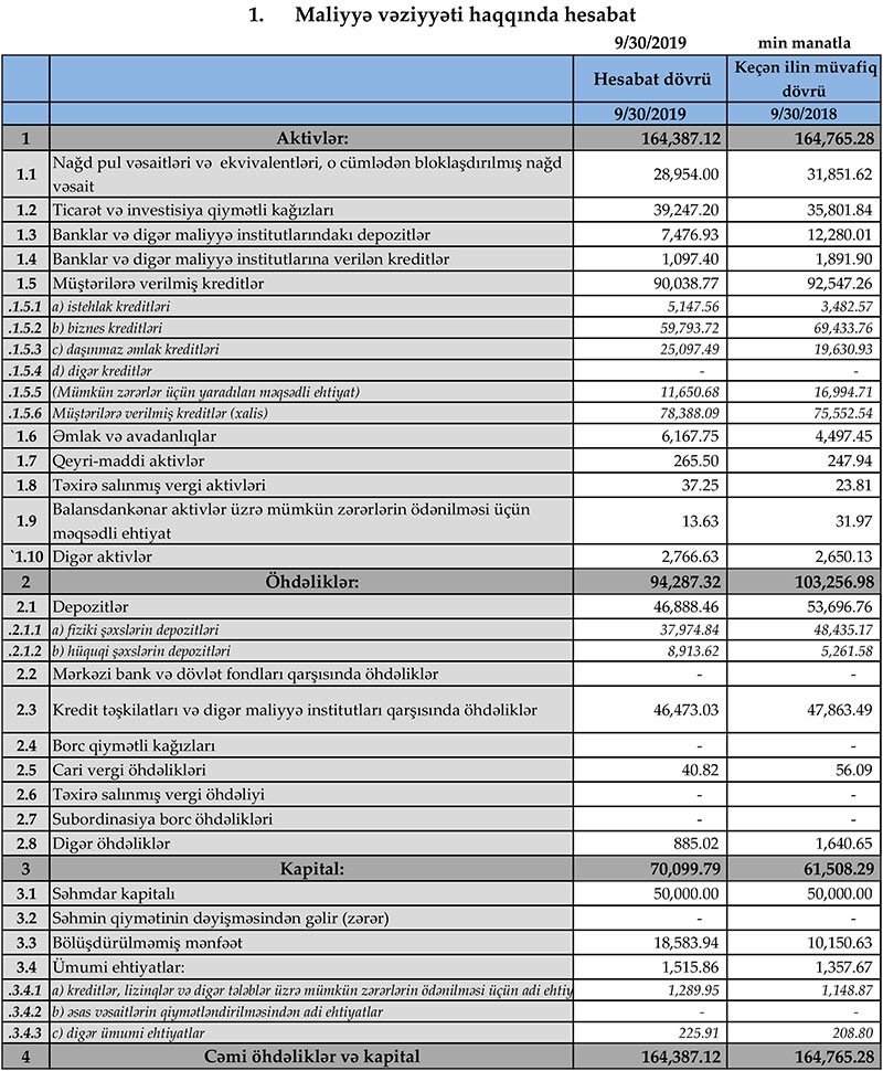 30 Sentyabr 2018-ci il tarixində biznes kreditləri portfeli 3 milyon 483 min manat, daşınmaz əmlak kreditləri portfeli 19 milyon 631 min manat təşkil etmişdi.