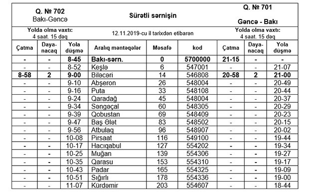 Məlumata görə, gündüz vaxtının qısalması səbəbindən və sərnişinlərin müraciətlərini nəzərə alaraq, “Azərbaycan Dəmir Yolları” QSC həmin istiqamətdə qatarların qrafikini yeniləyib. 702/701 nömrəli qatar Bakıdan saat 08:45-da yola düşəcək, saat 13:00-da Gəncəyə çatacaq. Gəncədən saat 17:00-da yola düşən qatar isə saat 21:15-də Bakıda olacaq.