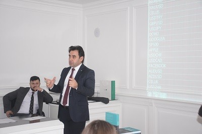 Sonra “İnvest-AZ İnvestisiya Şirkəti” QSC-nin təhsil üzrə meneceri Rövşən Məmmədov “Maliyyə bazarlarında praktiki vəziyyət” mövzusunda geniş mühazirə oxuyub. O, mühazirəsində müvafiq sahədə tələbələrə ətraflı və mövzunun mahiyyətini açıqlayan məlumat verib. R.Məmmədov çıxışı zamanı birjalar, birjaların növləri, birjaların iştirakçıları, birjada ticarətin növləri, maliyyə aktivlərinin alış və satışından mənfəət əldə etmək imkanları, marjinal ticarət, kredit çiyni, “Meta Trader 4” ticarət proqramı, “Best İnvestor” və s. məsələləri geniş şərh edib. O, nəzəri fikirlərini praktik misallarla izah edərək maliyyə bazarlarının idarə edilməsi və orada baş verən silkələnmələrə təsir edən amillərin qiymətləndirilməsi ilə bağlı indikatorları da açıqlayıb.