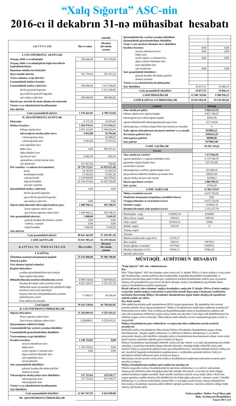 “Marja” Şirkətin maliyyə hesabatlarına istinadən xəbər verir ki, 2016-cı ildə “Xalq Sığorta”nın cəmi gəlirləri 18 milyon 257 min manat, cəmi xərcləri isə 11 milyon 584 min manat təşkil edib. 2015-ci ildə Şirkətin cəmi gəlirləri 22 milyon 358 min manat, cəmi xərcləri isə 13 milyon 779 min manat təşkil etmişdi.