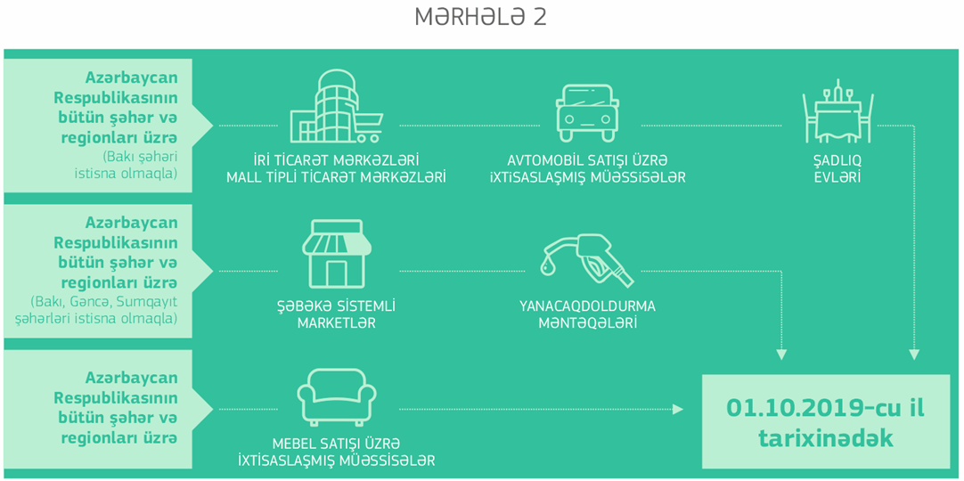 Oktyabr ayının əvvəlinədək ölkədəki iri ticarət mərkəzləri, şadlıq evləri, şəbəkə marketlər, yanacaqdoldurma məntəqələri avtomobil və mebel satışı mərkəzləri e-kassa sisteminə keçməlidilər. Azərbaycanda bu kimi obyektlərin sayının on minlərlə olduğunu nəzərə alsaq POS-terminalların sayının 1381 ədəd artması zəif artımdır.