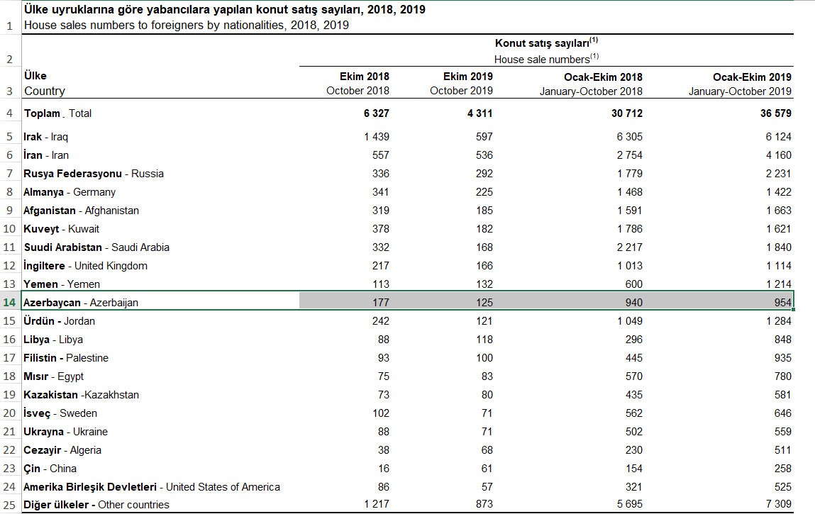 2019-cu ilin Yanvar-Oktyabr dövründə (10 ayda) isə azərbaycanlılar Türkiyədə 954 mənzil alıblar (orta hesabla hər gün 3 mənzil). 2018-ci ilin eyni dövründə bu say 940 idi.