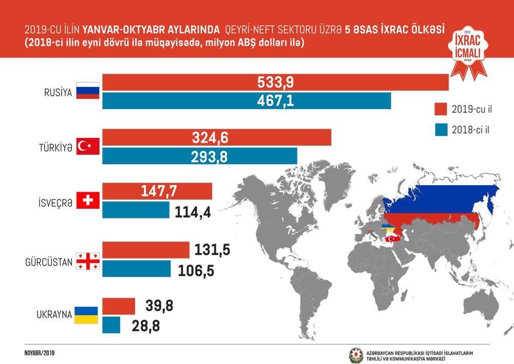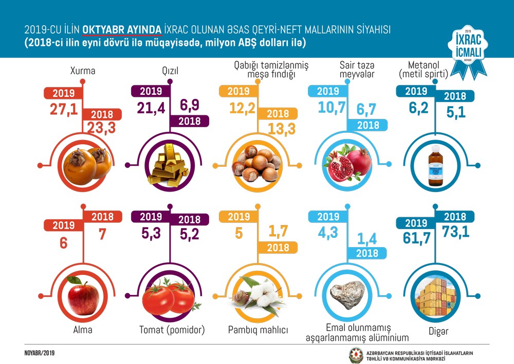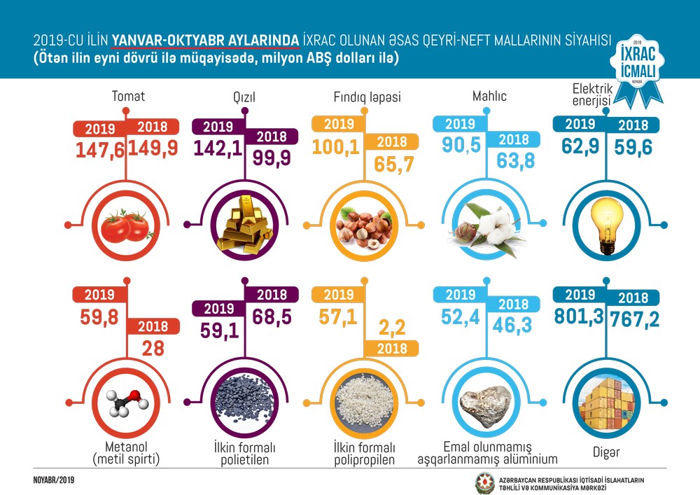 2018-ci ilin müvafiq dövrü ilə müqayisədə 2019-cu ilin 10 ayında Rusiyaya qeyri-neft ixracı 14 faiz, Türkiyəyə 10 faiz, İsveçrəyə 29 faiz, Gürcüstana 23 faiz və Ukraynaya 38 faiz artıb. 2019-cu ilin yanvar-oktyabr ayları ərzində ixrac edilən qeyri-neft sektoruna aid malların siyahısında isə pomidor (147,6 milyon ABŞ dolları) liderliyini qoruyub. Bu siyahıda qızıl (sikkə kəsilməsində istifadə olunmayan, digər emal olunmamış formalarda – 142,1 milyon ABŞ dolları) ikinci və qabığı təmizlənmiş meşə fındığı (100,1 milyon ABŞ dolları) üçüncü yerdə qərarlaşıb.