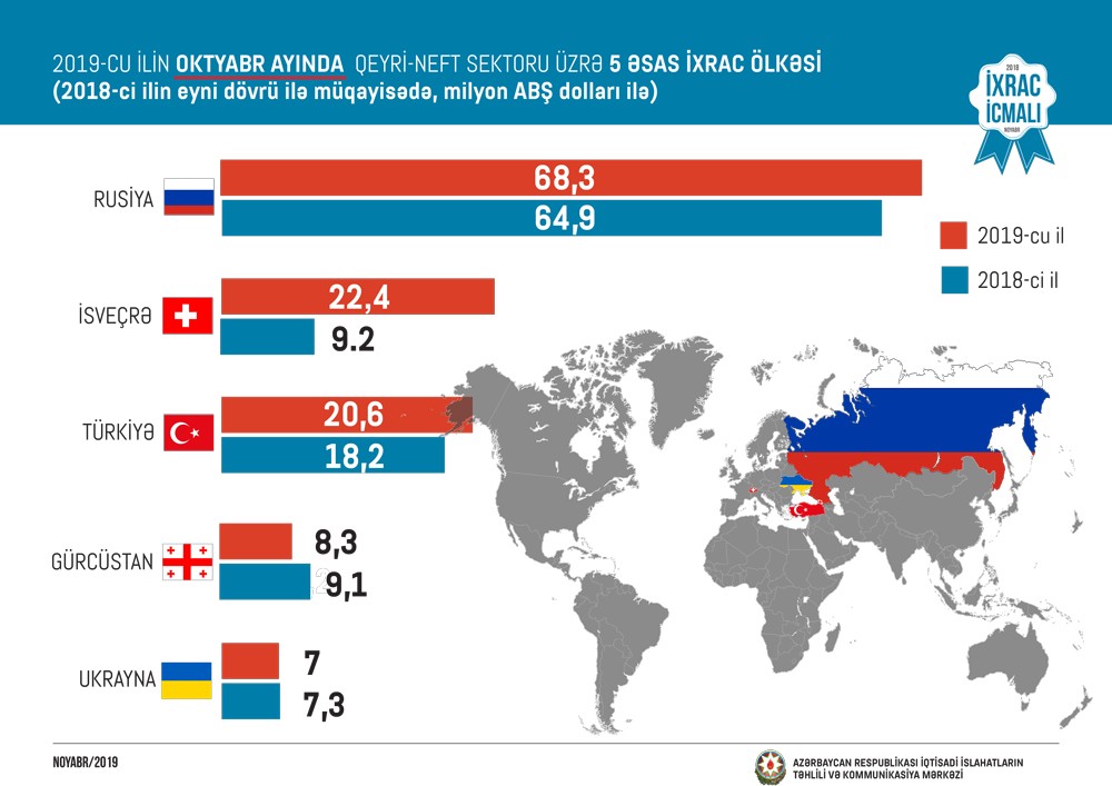 2019-cu ilin oktyabr ayında isə qeyri-neft sektoru üzrə ixrac 160 milyon ABŞ dolları təşkil edib. 2018-ci ilin oktyabr ayı ilə müqayisədə 2019-cu ildə qeyri-neft sektoru üzrə ixrac 16 milyon ABŞ dolları və ya 11 faiz artıb. Bu ilin oktyabr ayında qeyri neft-qaz məhsulları üzrə ən çox mal Rusiyaya (68,3 milyon ABŞ dolları), İsveçrəyə (22,4 milyon ABŞ dolları), Türkiyəyə (20,6 milyon ABŞ dolları), Gürcüstana (8,3 milyon ABŞ dolları) və Ukraynaya (7 milyon ABŞ dolları) ixrac edilib.