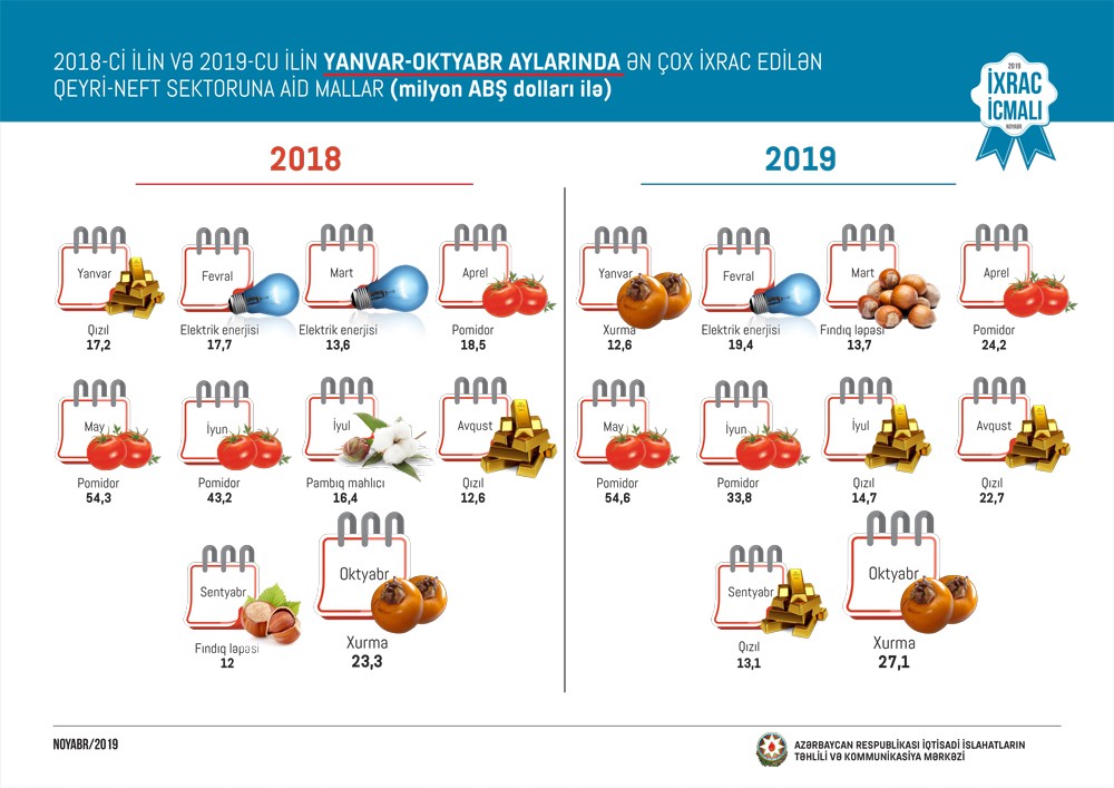 2019-cu ilin oktyabr ayında qeyri-neft sektoru üzrə ixracda xurma (27,1 milyon ABŞ dolları) birinci, qızıl (sikkə kəsilməsində istifadə olunmayan, digər emal olunmamış formalarda - 21,4 milyon ABŞ dolları) ikinci, qabığı təmizlənmiş meşə fındığı (10,7 milyon ABŞ dolları) üçüncü olub.