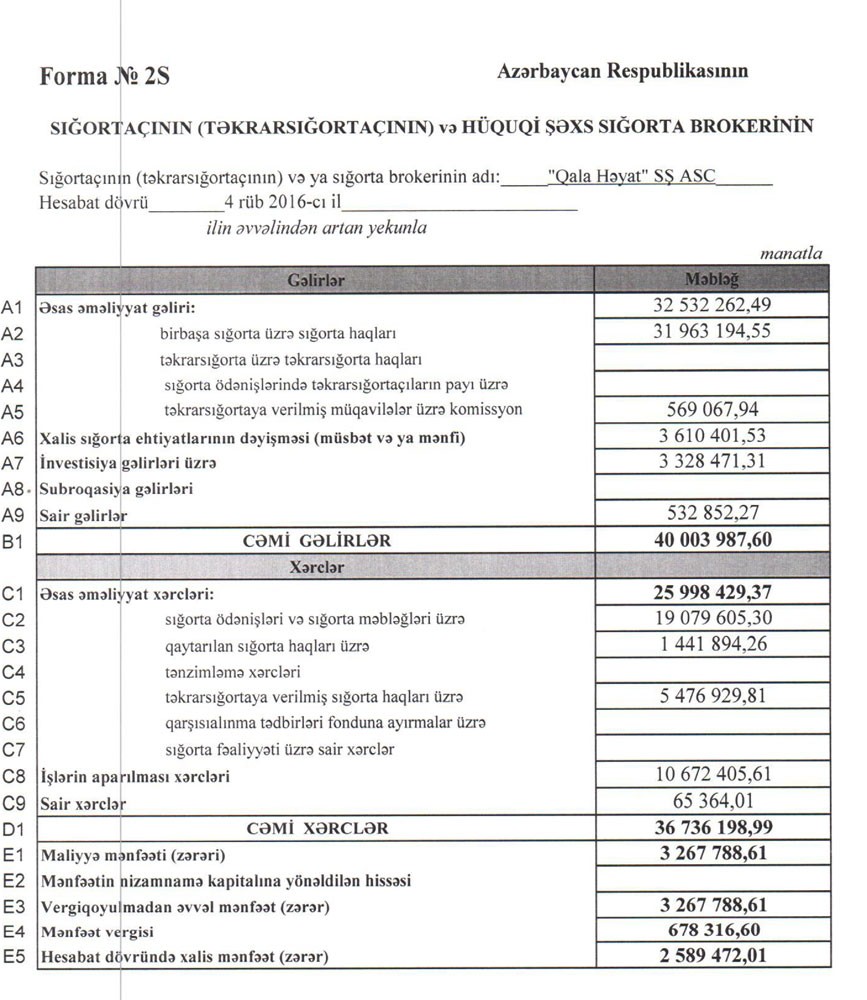 “Qala Həyat” Sığorta şirkəti 2016-cı ili 2 milyon 589 min manat xalis mənfəət ilə başa vurub. Bu, 2015-ci illə müqayisədə çoxdur. Belə ki, Şirkət 2015-ci ildə 2 milyon 185 min manat xalis mənfəət açıqlamışdı.