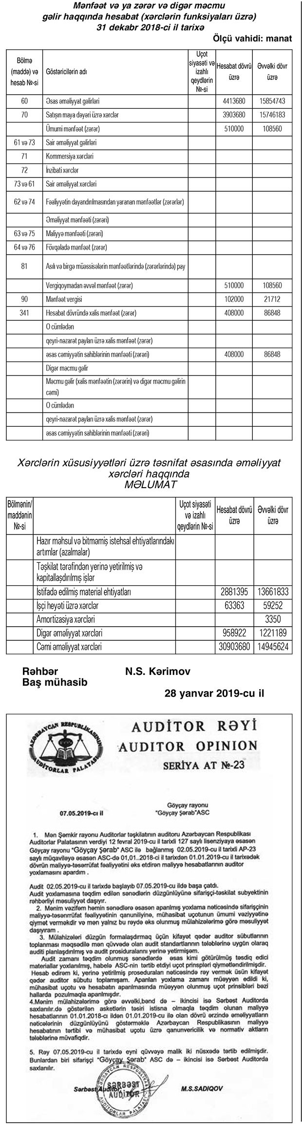 Şirkətin əməliyyat xərcləri isə 15 milyon 746 min manatdan 3 milyon 904 min manata geriləyib (4 dəfə azalıb). Xərclər daha çox azaldığından “Göyçay Şərab”ın əməliyyat mənfəəti 2017-ci illə müqayisədə 2018-ci ildə 4,7 dəfə çox – 510 min manat təşkil edib. Şirkət əməliyyat mənfəətindən 102 min manat mənfəət vergisi ödəyib, beləliklə, ötən il 408 min manat xalis mənfəət ilə bağlanıb.