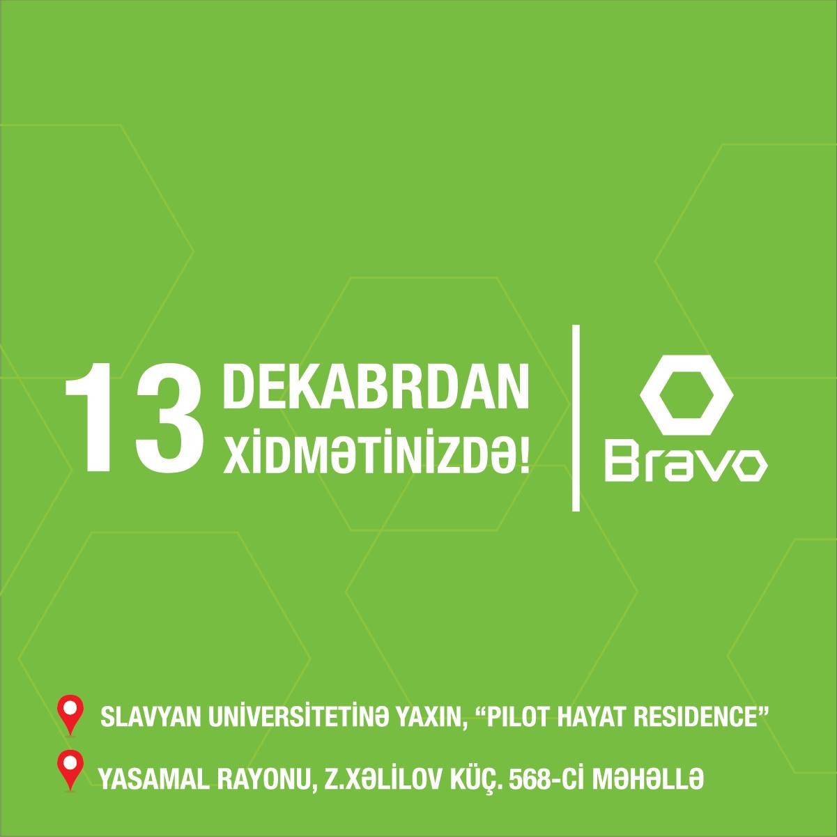 "Marja" xəbər verir ki, növbəti "Bravo"lar "Pilot Hayat Residence"də (Slavyan Universitetinin yaxınlığı) və Yasamal rayoni Z. Xəlilov kü, 568-ci məhəllədə istifadəyə veriləcəkdir.