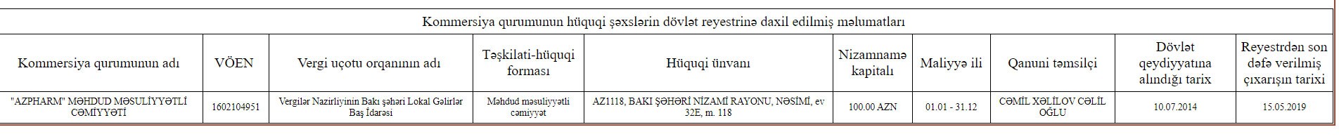 “Marja”nın rəsmi mənbələrdən əldə etdiyi məlumata görə, "AzPharm" şirkəti 2014-cü ildə yaradılmış “NNN” MMC-nin hüquqi varisidir. Şirkətin qanuni təmsilçisi Cəmil Cəlil oğlu Xəlilovdur.