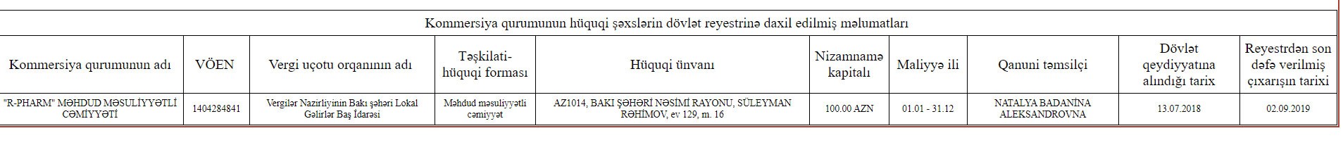 2018-ci ildə Vergilər Nazirliyinin dövlət qeydiyyatına aldığı “R-Pharm” MMC 100 manat nizamnamə kapitalına malikdir. Şirkətin qanuni təmsilçisi Natalya Badanina Aleksandrovnadır. “R-Pharm” MMC-nin hüquqi ünvanı Bakı şəhəri, Nəsimi Rayonu, Süleyman Rəhimov, ev 129, m.16-dır.