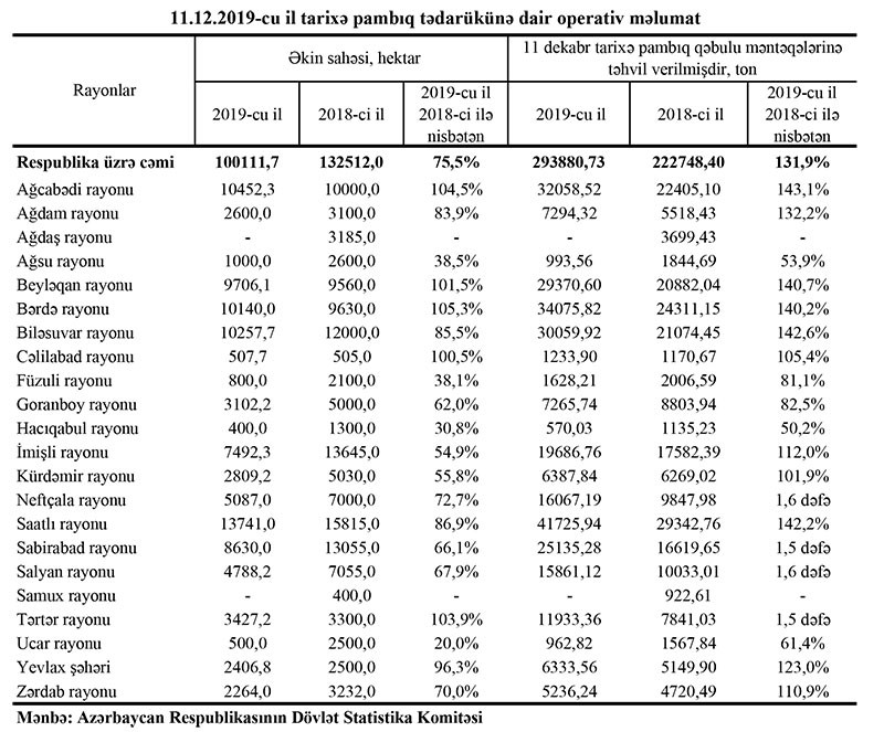 Respublikada pambıq tədarükünə dair dekabrın 11-nə olan operativ məlumatı təqdim edirik.