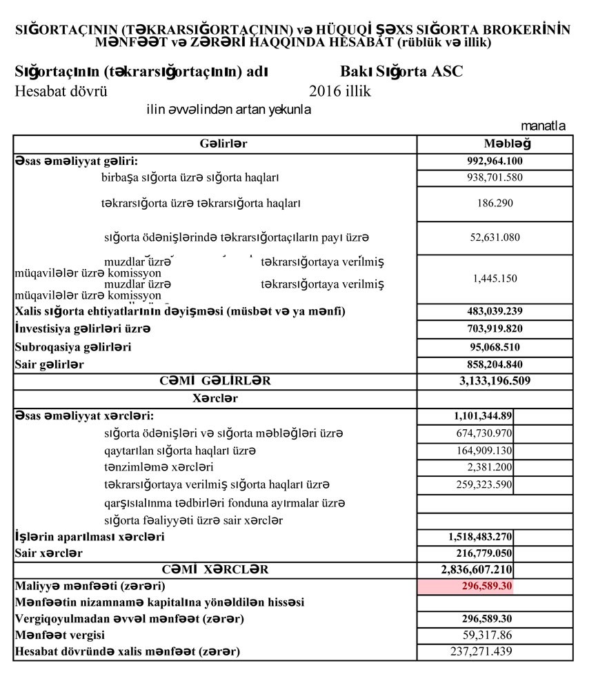 “Bakı Sığorta” ASC 2016-cı ili 237 min 271 manat xalis mənfəət ilə başa vurub. Xatırladaq ki, şirkət 2015-ci ildə 1 milyon 91 min manat mənfəət əldə etdiyini açıqlamışdı. Beləliklə, 2015-ci illə müqayisədə ötən il Şirkətin xalis mənfəəti 4,2 dəfə azalıb. Xalis mənfəətin azalmasına səbəb Şirkətin gəlirlərinin aşağı düşməsidir.