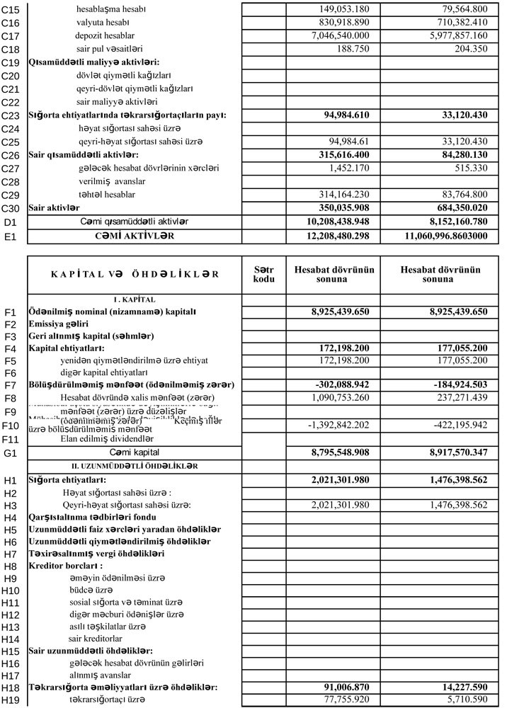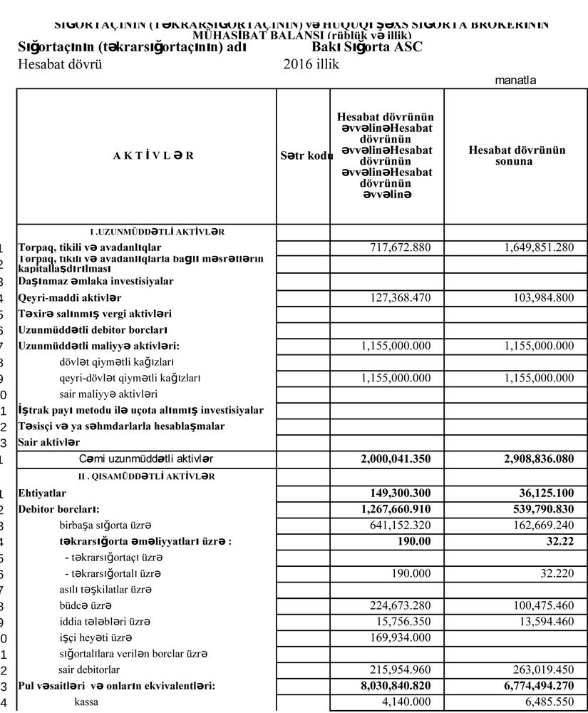 31 Dekabr 2016-cı il tarixində “Bakı Sığorta” 11 milyon 60 min manat cəmi aktivlərə (2015-də 12 milyon 208 min manat), 8 milyon 917 min manat cəmi kapitala (2015-də 8 milyon 795 min manat), 2 milyon 143 min manat cəmi öhdəliklərə (2015-də 3 milyon 412 min manat) malik olub.