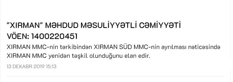 Belə ki, "Xırman" MMC-nin tərkibindən "Xırman Süd" MMC-nin ayrılması nəticəsində "Xırman" MMC yenidən təşkil olunduğunu elan edib.