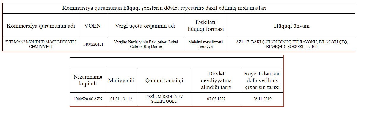 Kommersiya qurumlarının dövlət reyestri məlumatlarına görə, 1 milyon 520 manat nizamnamə kapitalı olan "Xırman" MMC-nin qanuni təmsilçisi Mirzəliyev Fazil Sədri oğludur.