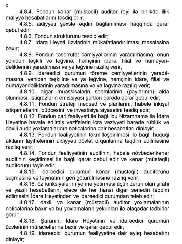 Fondun Himayəçilik Şurasının sədri Azərbaycan Respublikası Kənd Təsərrüfatı Nazirliyinin nümayəndəsidir.
