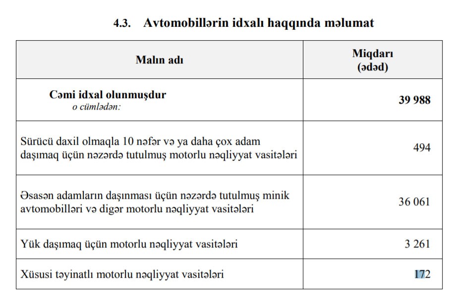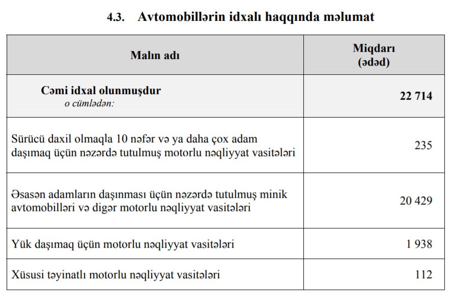 O cümlədən, 2019-cu ilin yanvar-noyabr aylarında Azərbaycana 36 min 61 ədəd minik avtomobilləri, 494 ədəd avtobus, 3 min 261 ədəd yük avtomobili və 172 ədəd xüsusi təyinatlı vasitə idxal olunub.
