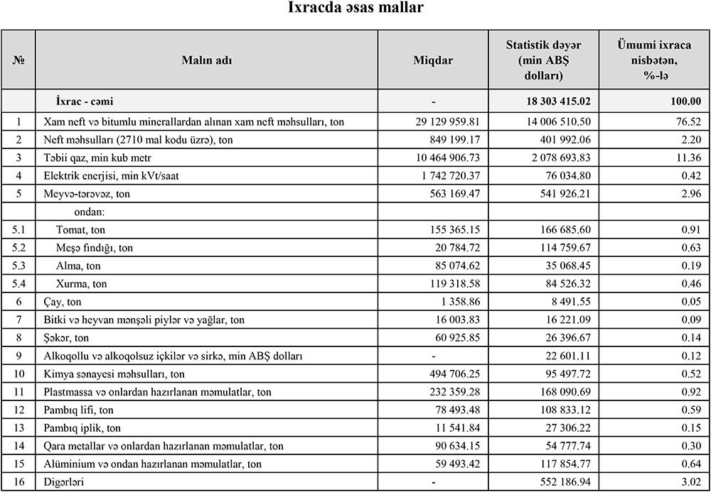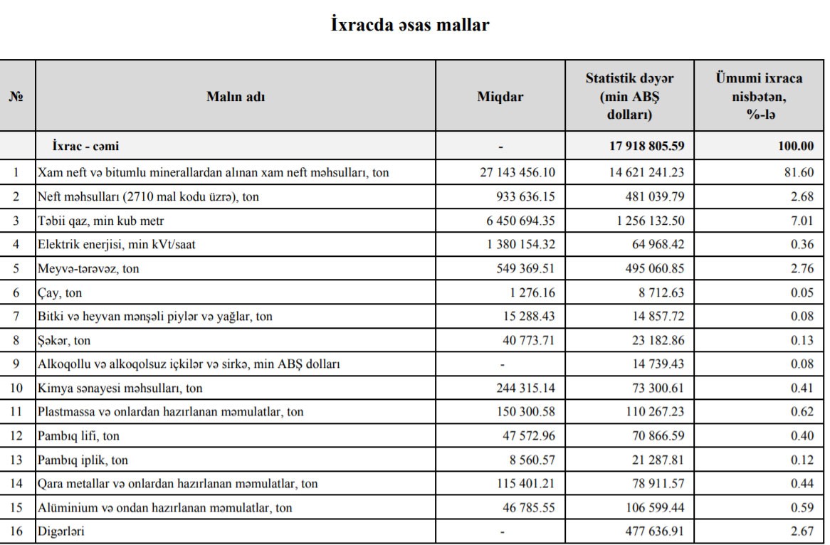 2018-ci ilin 11 ayı ərzində Azərbaycandan 14 milyard 621 milyon dollar dəyərində 27 milyon 143 min ton xam neft və bitumlu minerallardan alınan xam neft məhsulları ixrac edilmişdi. Beləliklə, bu qrup üzrə ixrac miqdar ifadəsində 7,3% artıb, məbləğ ifadəsində isə 4,4% (615 milyon dollar) azalıb. Qısası, keçən ildəkindən də çox neft satıb daha az gəlir əldə etmişik.
