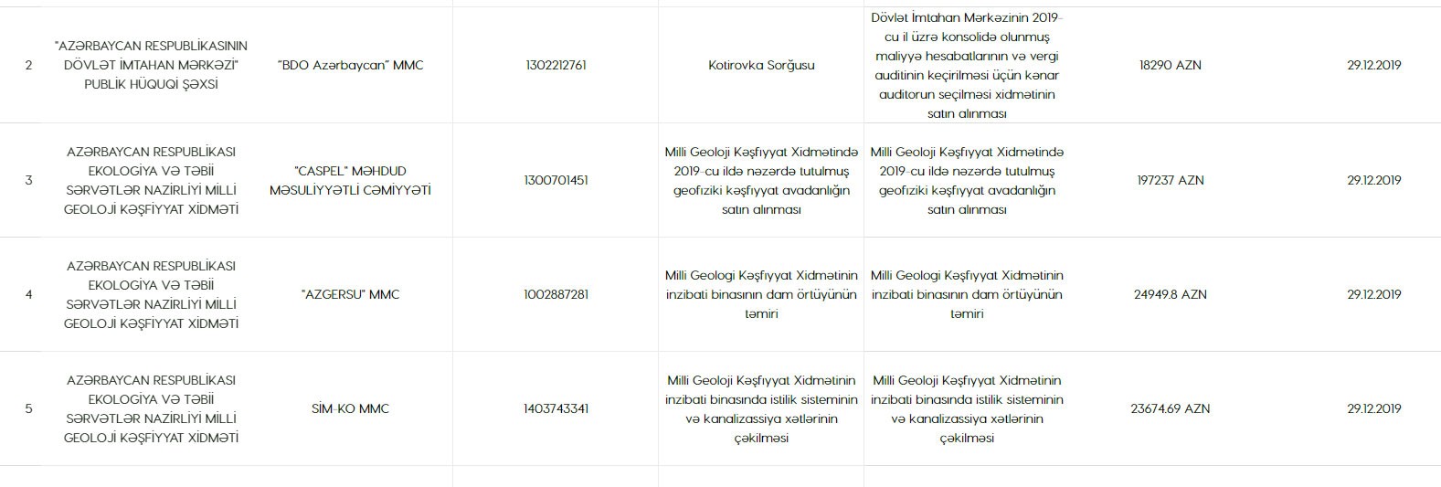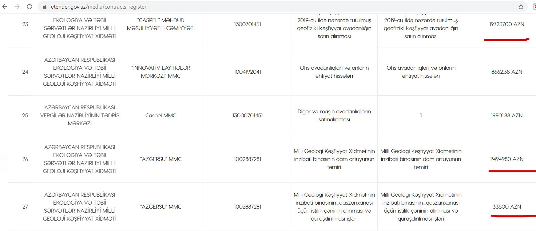 Saat 10:15 - Ekologiya və Təbii Sərvətlər Nazirliyi Milli Geoloji Kəşfiyyat Xidmətinin elan etdiyi tenderlərinin qaliblərinin adları və bağlanmış müqavilələrin məbləğləri məlum olub.