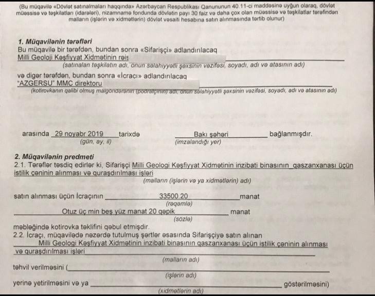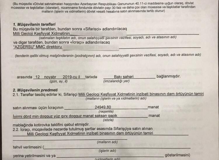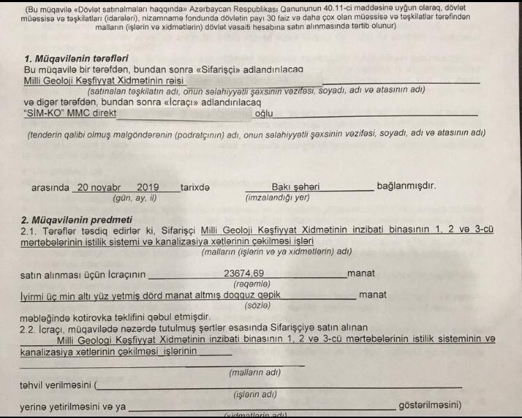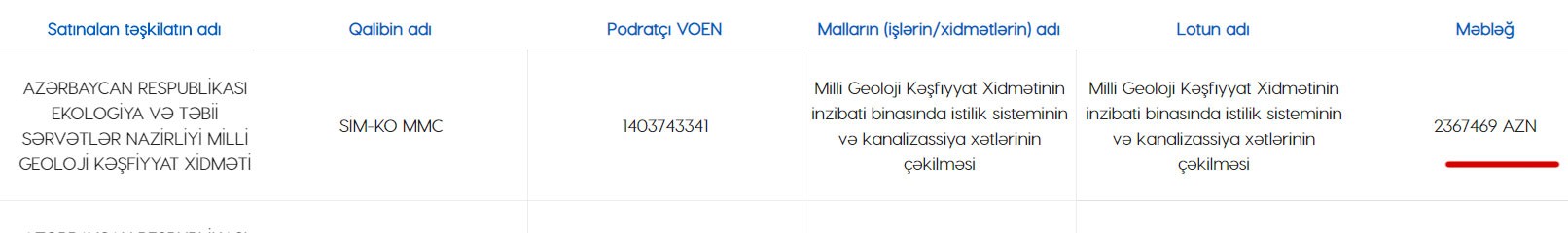 Həmçinin Milli Geoloji Kəşfiyyat Xidməti “SİM-KO ” MMC ilə də müqavilə bağlayıb. Məbləği 2 milyon 367 min manat olan müqavilə “Milli Geoloji Kəşfiyyat Xidmətinin inzibati binasında istilik sisteminin və kanalizasiya xətlərinin çəkilməsi”ni nəzərdə tutur.