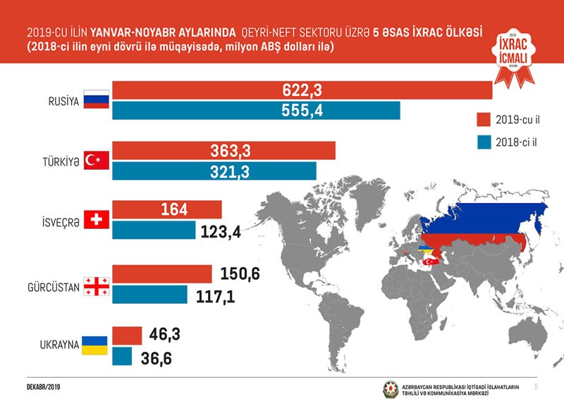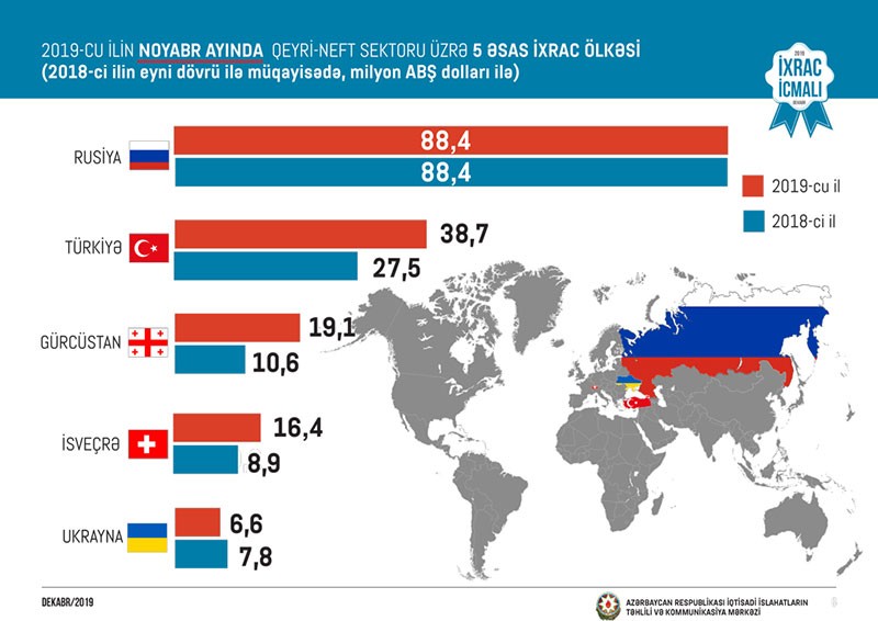 2018-ci ilin müvafiq dövrü ilə müqayisədə 2019-cu ilin 11 ayında Rusiyaya qeyri-neft ixracı 12 faiz, Türkiyəyə 13 faiz, İsveçrəyə 33 faiz, Gürcüstana 29 faiz və Ukraynaya 27 faiz artıb.