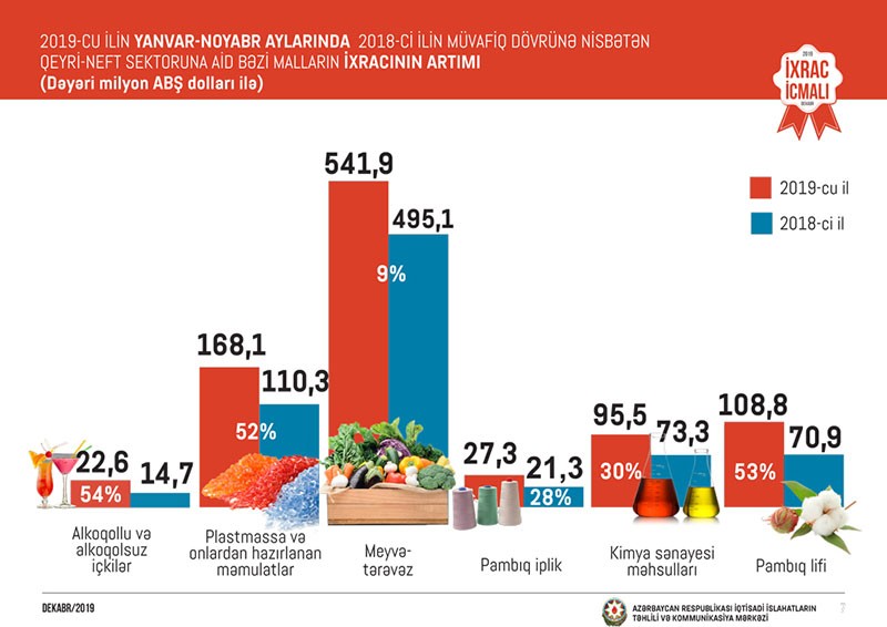 2018-ci ilin müvafiq dövrü ilə müqayisədə cari ilin yanvar-noyabr aylarında alkoqollu və alkoqolsuz içkilərin ixracı 54 faiz, pambıq lifinin ixracı 53 faiz, plastmassa və onlardan hazırlanan məmulatların ixracı 52 faiz, kimya sənayesi məhsullarının ixracı 30 faiz, pambıq ipliyinin ixracı 28 faiz, elektrik enerjisi ixracı 17 faiz, şəkər ixracı 14 faiz, alüminium və ondan hazırlanan məmulatların ixracı 11 faiz, meyvə-tərəvəzin ixracı 9 faiz artıb.