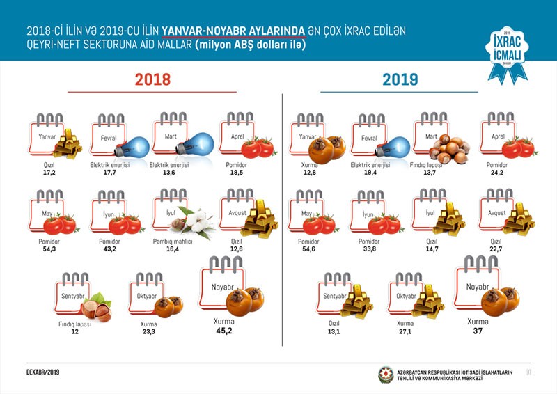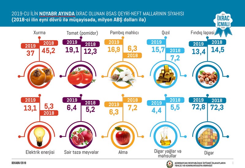 2019-cu ilin noyabr ayında qeyri-neft sektoru üzrə ixracda xurma (37 milyon ABŞ dolları) birinci, tomat (pomidor - 19,1 milyon ABŞ dolları) ikinci, pambıq mahlıcı (16,9 milyon ABŞ dolları) üçüncü yerdə qərarlaşıb.