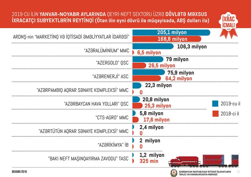 Qeyri-neft sektoru üzrə ixrac əməliyyatlarında iştirak edən dövlətə məxsus şirkətlərin siyahısına isə ARDNŞ-nin “Marketinq və İqtisadi Əməliyyatlar İdarəsi” başçılıq edir. Daha sonra bu siyahıda aşağıdakı şirkətlər təmsil olunurlar: "Azəralüminium" MMC, "Azergold" QSC, "Azərenerji" ATSC, "Azərbaycan Hava Yolları" QSC, "Azərpambıq Aqrar Sənaye Kompleksi" MMC, “CTS-Agro” MMC, "Azərtütün Aqrar Sənaye Kompleksi" MMC, "Azərikimya" İB, "Bakı Neft Maşinqayırma Zavodu" TASC.