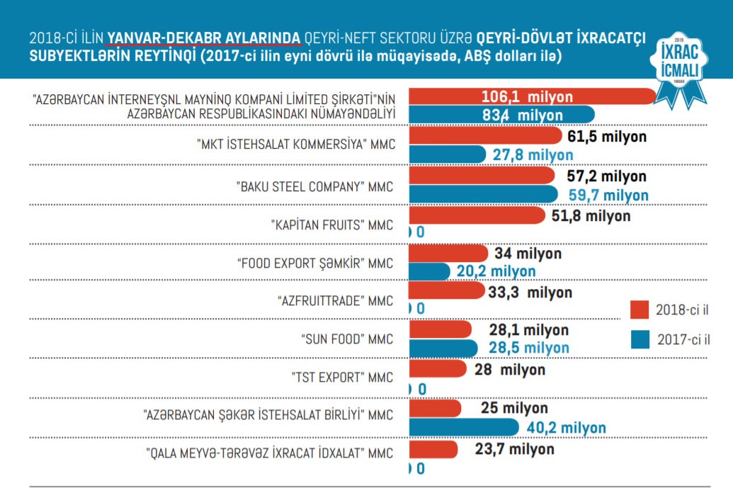 “Marja” xəbər verir ki, 2018-ci ildə qeyri-neft sektoru üzrə qeyri-dövlət ixracatçı şirkətlərin siyahısında ilk onluğa daxil olan şirkətin adı bu il onluqda yoxdur.