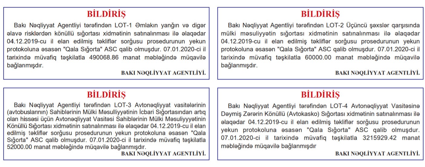 Bakı Nəqliyyat Agentliyi, "Əmlakın yanğın və əlavə risklərdən sığortası", "Avtonəqliyyat Vasitəsi Sahiblərinin Mülki Məsuliyyətlərinin Könüllü Sığortası", "Üçüncü şəxslər qarşısında mülki məsuliyyətin sığortası" və "Avtokasko" xidmətlərinin satın alınması üçün elan etdiyi təkliflər sorğularını yekunlaşdırıb.