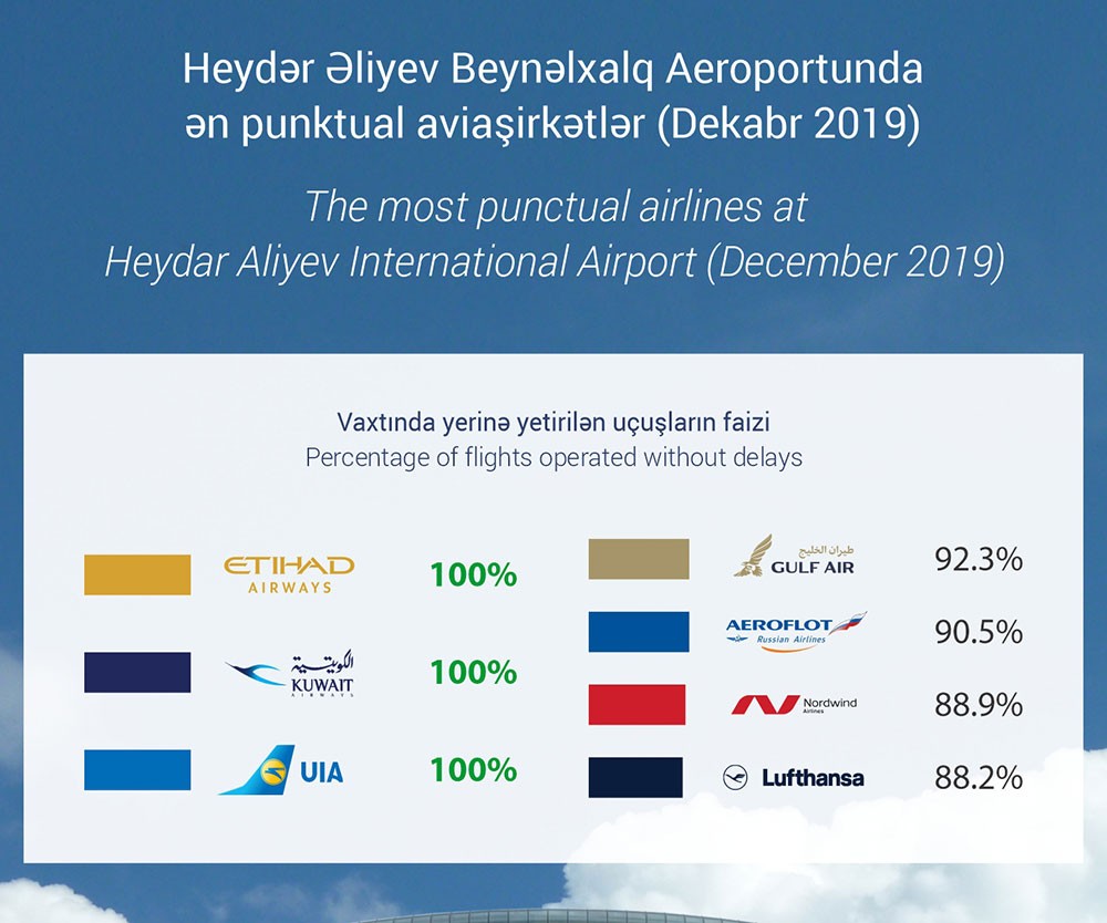 Heydər Əliyev Beynəlxalq Aeroportunun mətbuat xidmətinin yaydığı məlumata görə, 2019-cu ilin dekabr ayı ərzində Bakıdan yola düşərkən üç aviaşirkət – “Etihad Airways”, “Kuwait Airways” və “UIA” (Ukrayna Beynəlxalq Hava Yolları) 100% punktuallıq göstərmişdirlər.