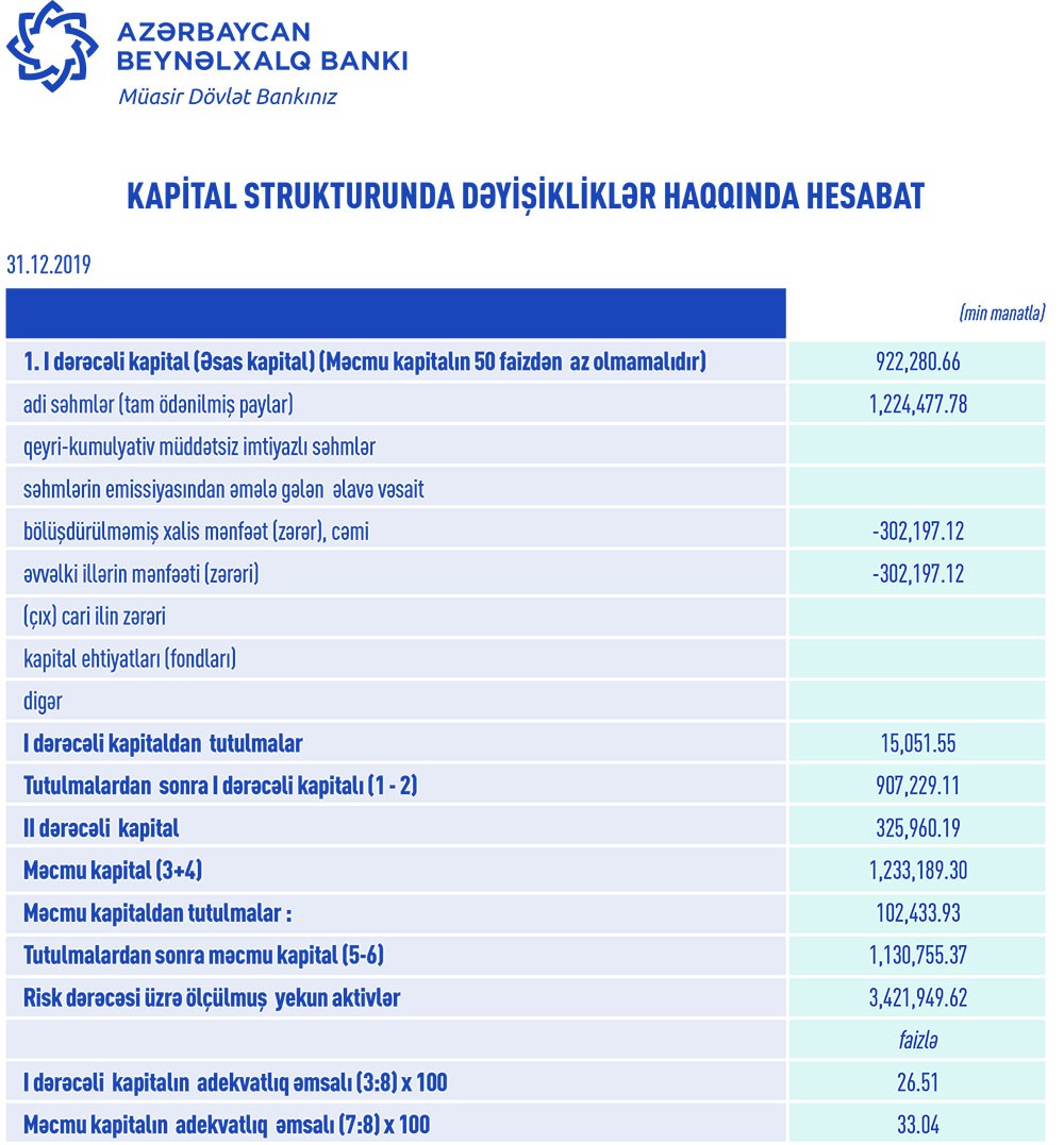 31 Dekabr 2019-cu il tarixində Beynəlxalq Bank 1 milyard 130 milyon 755 min manat məcmu kapitala malik olub.