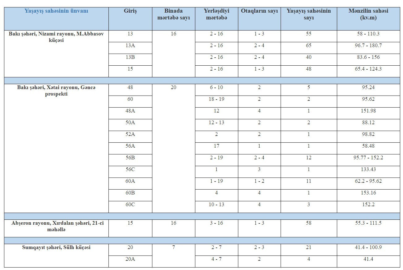 FOND TƏRƏFİNDƏN KİRAYƏYƏ VERİLMƏK ÜÇÜN ALINMIŞ MƏNZİLLƏRİN SİYAHISI