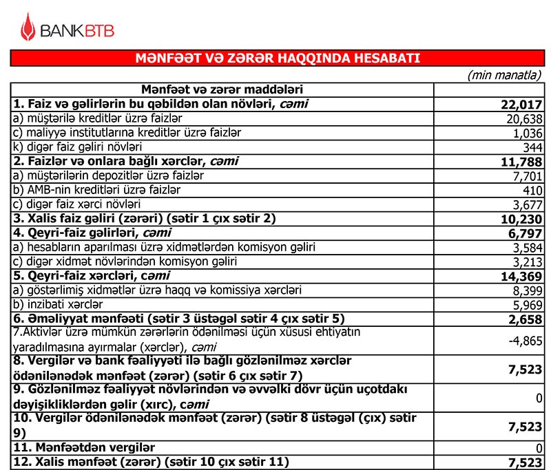 Müqayisə üçün qeyd edək ki, 2018-ci ildə “Bank BTB”nin cəmi gəlirləri 25 milyon 657 min manat, cəmi xərcləri 24 milyon 226 min manat təşkil etmiş, həmin il 1 milyon 431 min manat əməliyyat mənfəəti əldə etmişdi. Əməliyyat mənfəətinin 726 min manatı aktivlər üzrə mümkün zərərlərin ödənilməsi üçün xüsusi ehtiyatın yaradılmasına ayırıldığından Bank 2018-ci ili 704 min manat xalis mənfəət ilə başa vurmuşdu.