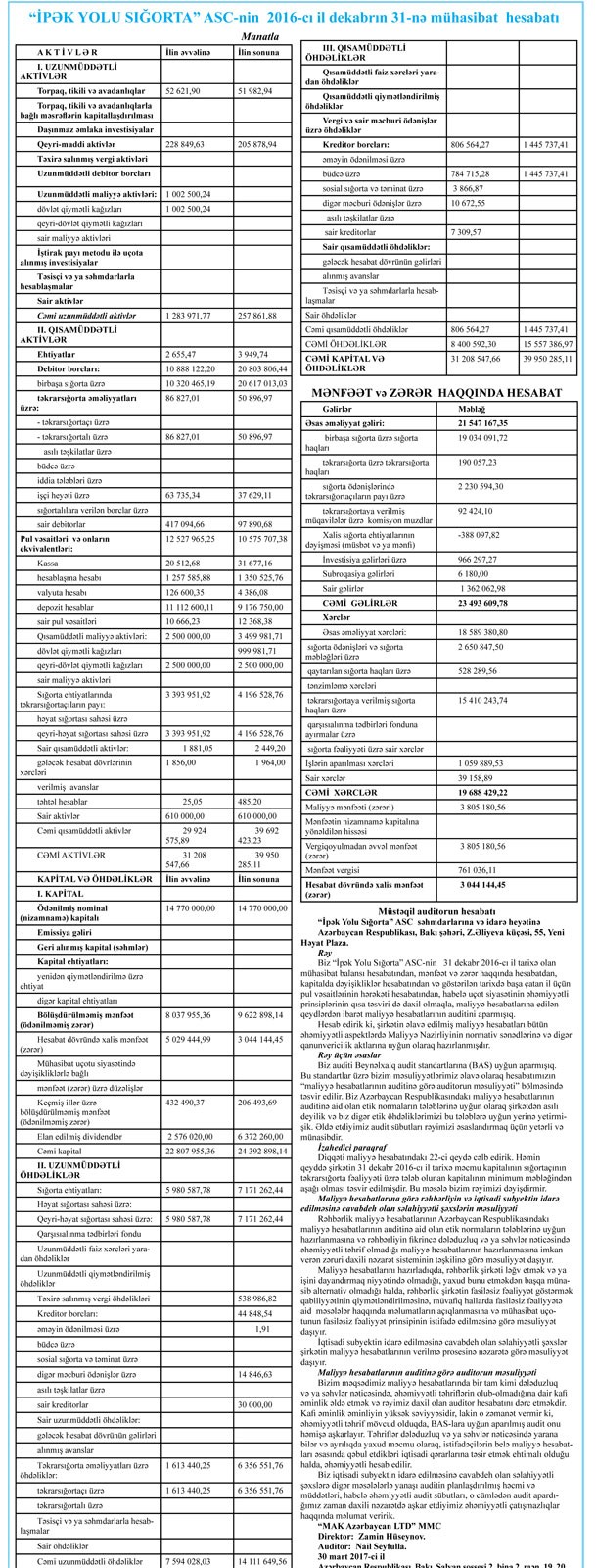 “Marja” Şirkətin maliyyə hesabatlarına istinadən xəbər verir ki, ötən il “İpək Yolu Sığorta” ASC-nin cəmi gəlirləri 23 milyon 494 min manat, cəmi xərcləri isə 19 milyon 688 min manat təşkil edib. Şirkətin 2015-ci ildə cəmi gəlirləri 20 milyon 402 min manat, cəmi xərcləri isə 18 milyon 371 min manat olmuşdu.