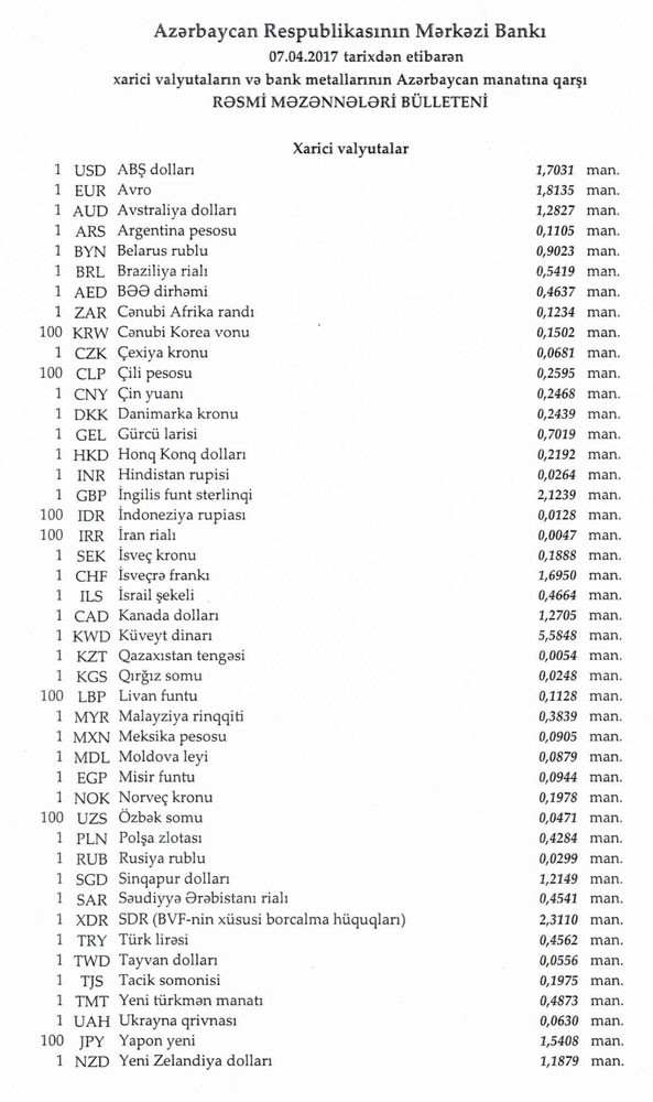 Aprelin 7-nə Mərkəzi Bankın açıqladığı rəsmi Dollar/manat məzənnəsi Aprelin 6-sı ilə müqayisədə düşərək 1,7031 manat olub, Avro/manat məzənnəsi isə 1.8135 manata düşüb.