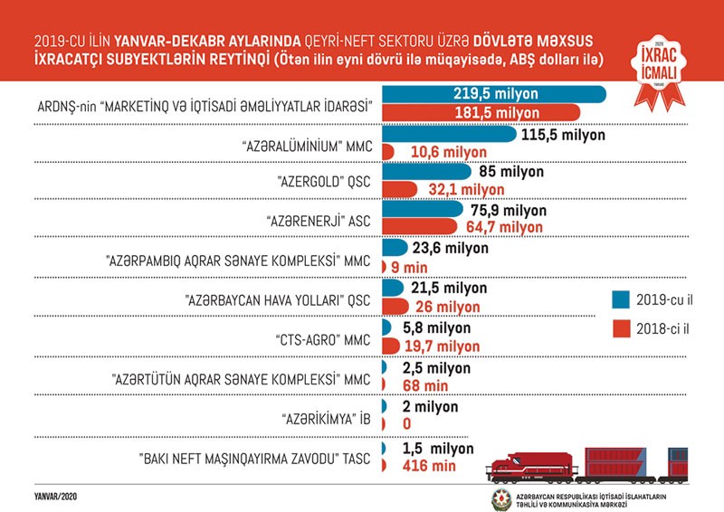2019-cu ilin yanvar-dekabr ayları üzrə hazırlanan qeyri-dövlət ixracatçı subyektlərin reytinqində ilk onluqda aşağıdakı subyektlər təmsil olunurlar: "Azərbaycan İnterneyşnl Mayninq Kompani Limited Şirkəti"nin Azərbaycan Respublikasındakı nümayəndəliyi, “Socar Polymer” MMC, "MKT İstehsalat Kommersiya" MMC, "Nine Climate" MMC, "Global Export Fruits" MMC, “Sun Food" MMC, "Natural Fruit" MMC, "Baku Steel Company", "Azərbaycan Şəkər İstehsalat Birliyi " MMC, "P-Aqro" MMC.