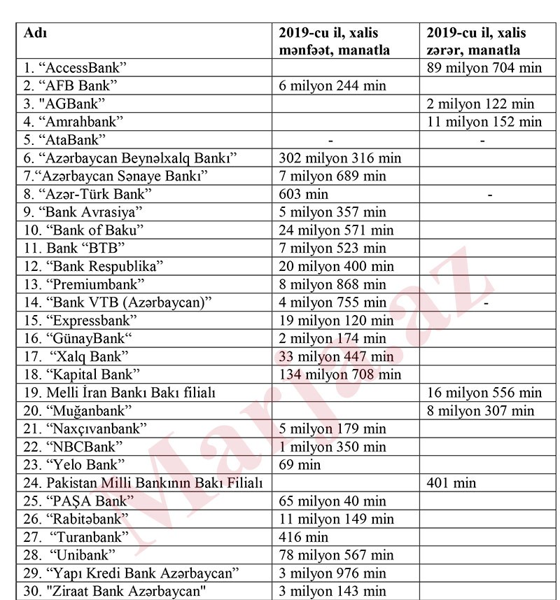 Marja-nın araşdırmasına görə, maliyyə göstəricilərini açıqlamış 29 bankdan 23-ü 2019-cu ili xalis mənfəət, 6-sı isə xalis zərər ilə başa vurub. Qalan 1 bankın (AtaBank) bu günlərdə maliyyə göstəricilərini dərc edəcəyi gözlənilir.